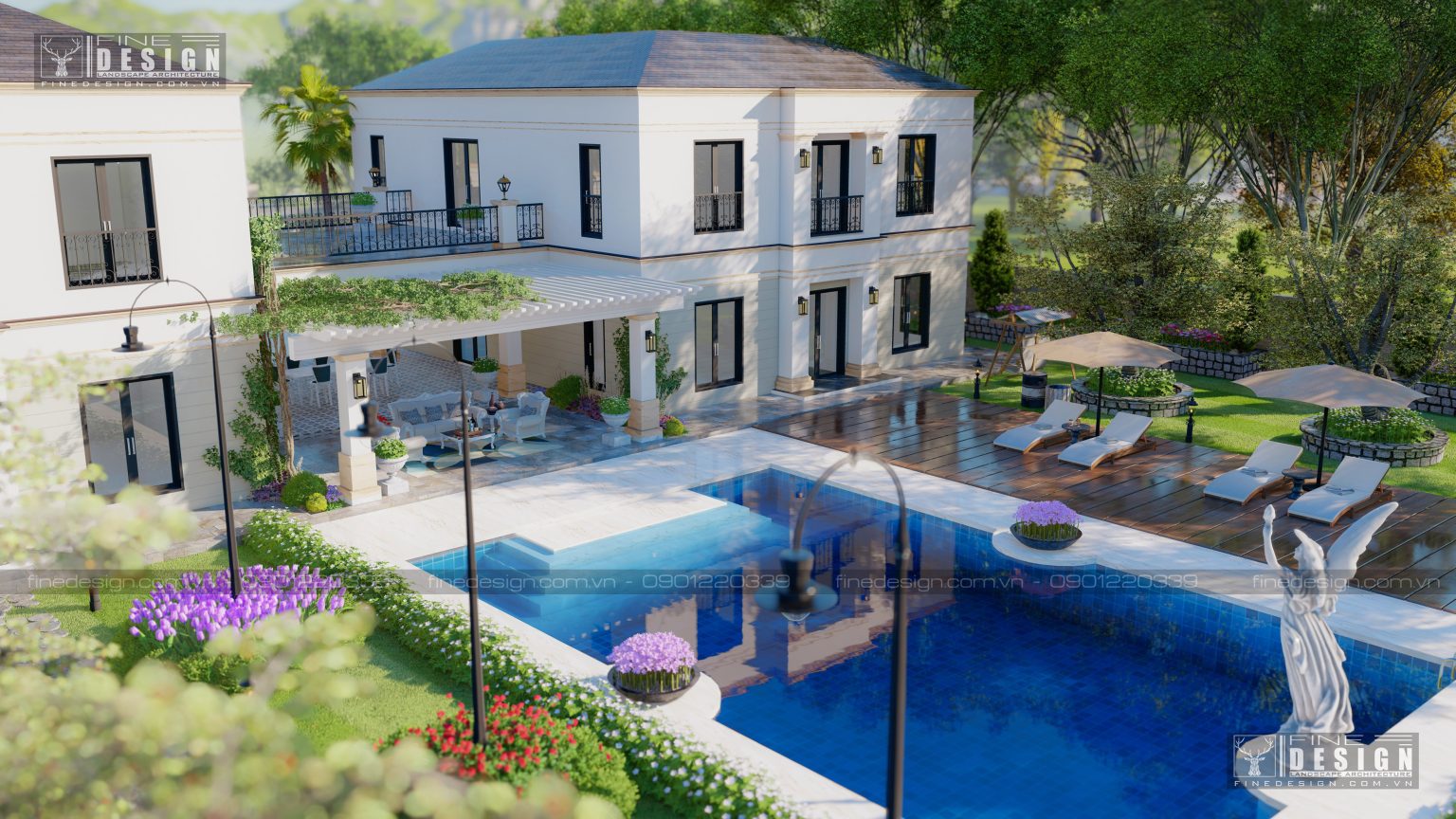 Sự kết hợp tuyệt vời bởi những hàng cây, rặng hoa, đài nước và thạch tượng,... làm tôn vinh vẻ đẹp của kiến trúc ngôi nhà, tạo ra không gian quý tộc đương đại.